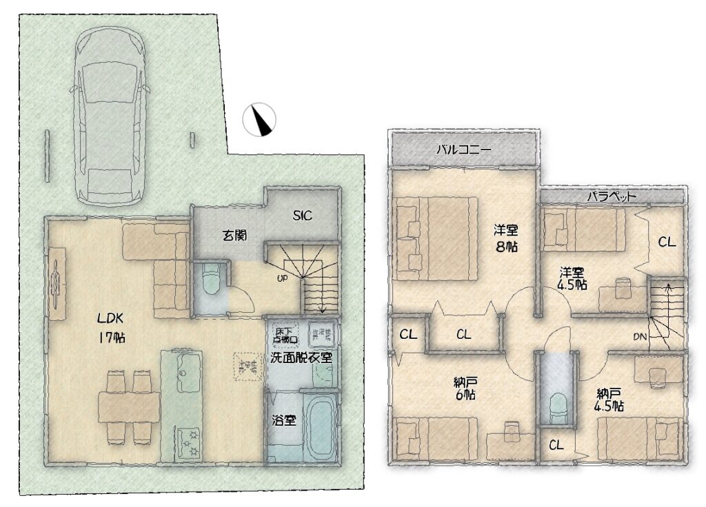 - 1階43.74㎡ 2階51.84㎡ 合計95.58㎡